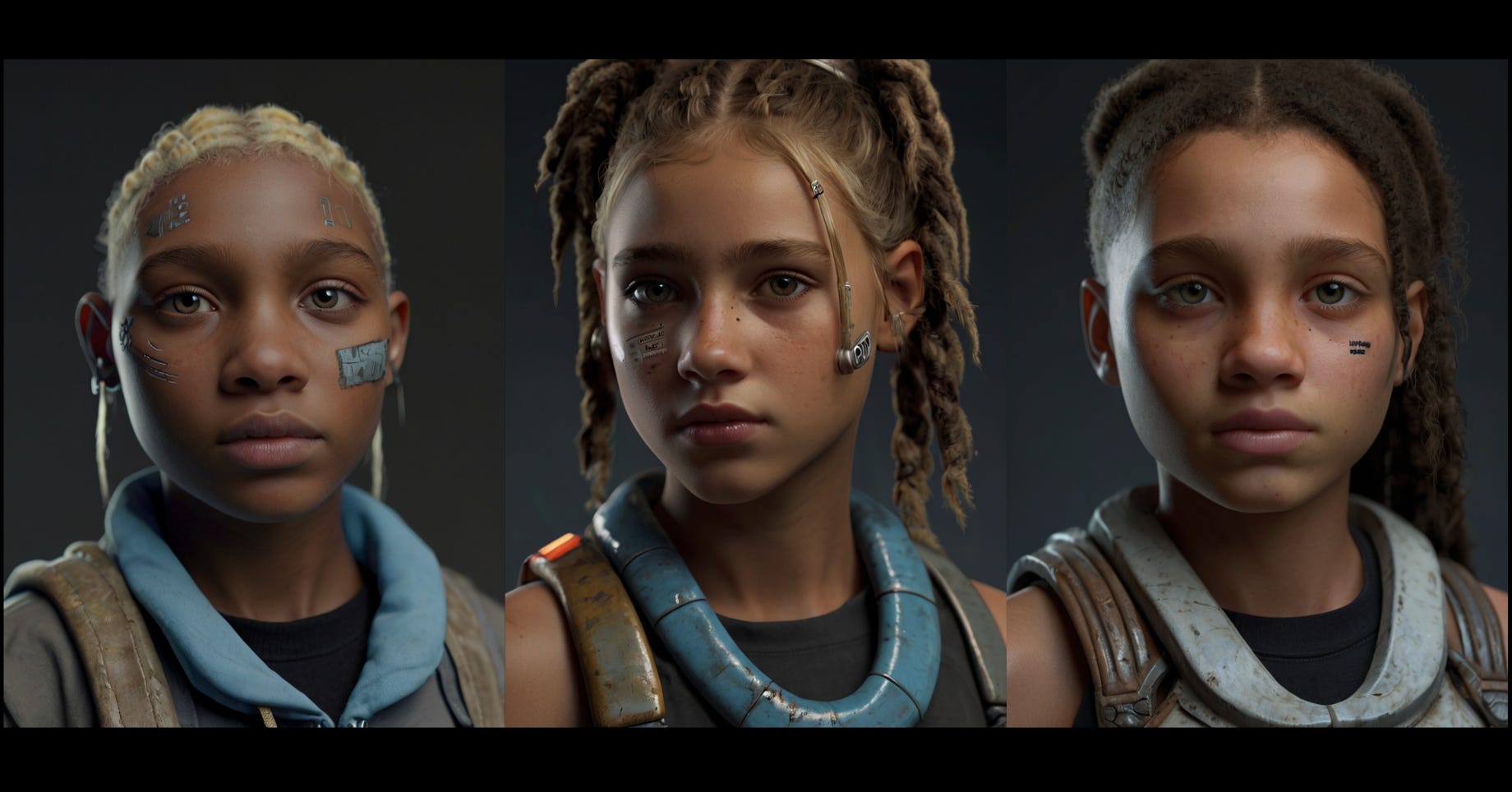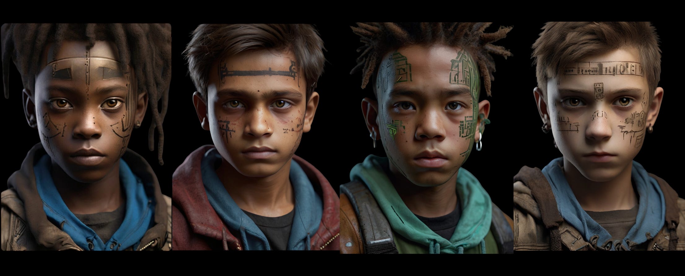 The patterns on Scavboy scouts' faces represent confirmed safe routes they've discovered in different danger zones while scavenging for supplies. These intricate patterns double as maps, navigating them through hazardous terrain and guaranteeing a safe return home. The markings also highlight areas abundant in viable supplies, indicating spots worth revisiting for salvaging. In case the dangerous terrain shifts, these scouts have alternative routes to navigate and knowledge of safe zones. Within the community, these markings symbolize bravery, resourcefulness, and success in supporting the community. The more routes imprinted on a Scavboy Scout's face, the greater they are esteemed. It's worth noting that "Scavboy scout" is a term; there are also female Scavscouts.
